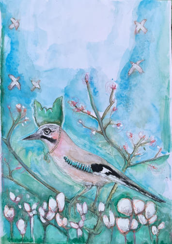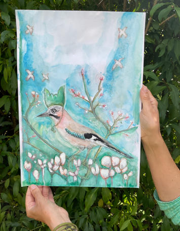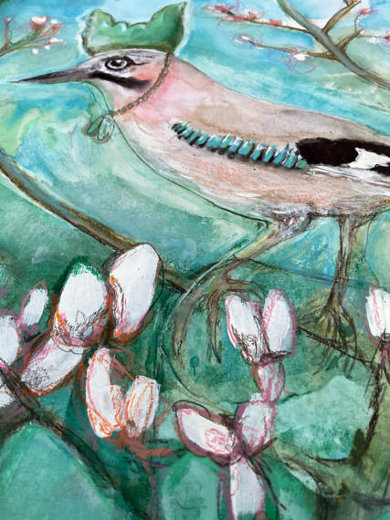 Das Krafttier Eichelhäher  Der Eichelhäher erscheint in deinem Leben, wenn deine Seele nach Rückverbindung ruft.  Er macht dich aufmerksam auf Momente, in denen äußere Stimmen dich von deinem Weg ablenken wollen.  Mit seinem klaren Ruf erinnert er dich daran, deine innere Stärke wiederzufinden und die Verbindung zu deinem Seelenlicht zu nähren.  Er ist Bote deiner Seele, Hüter deiner Energie und Wächter deiner wahren Kraft.    Mixed-Media auf Papier mit echter Eichelhäher-Feder im Format DIN A3 (30 x 42 cm)   Empfangen, gemalt und geliebt by Shinaja Du wirst automatisch zum Warenkorb auf Paypal weitergeleitet. Dort kannst Du aber auch andere Zahlungsmethoden auswählen.Klicke dazu auf den „Bezahlen“-Button unter dem Paypal-Button.  Um weitere Artikel hinzuzufügen, wechsle wieder zum Shop.