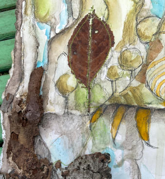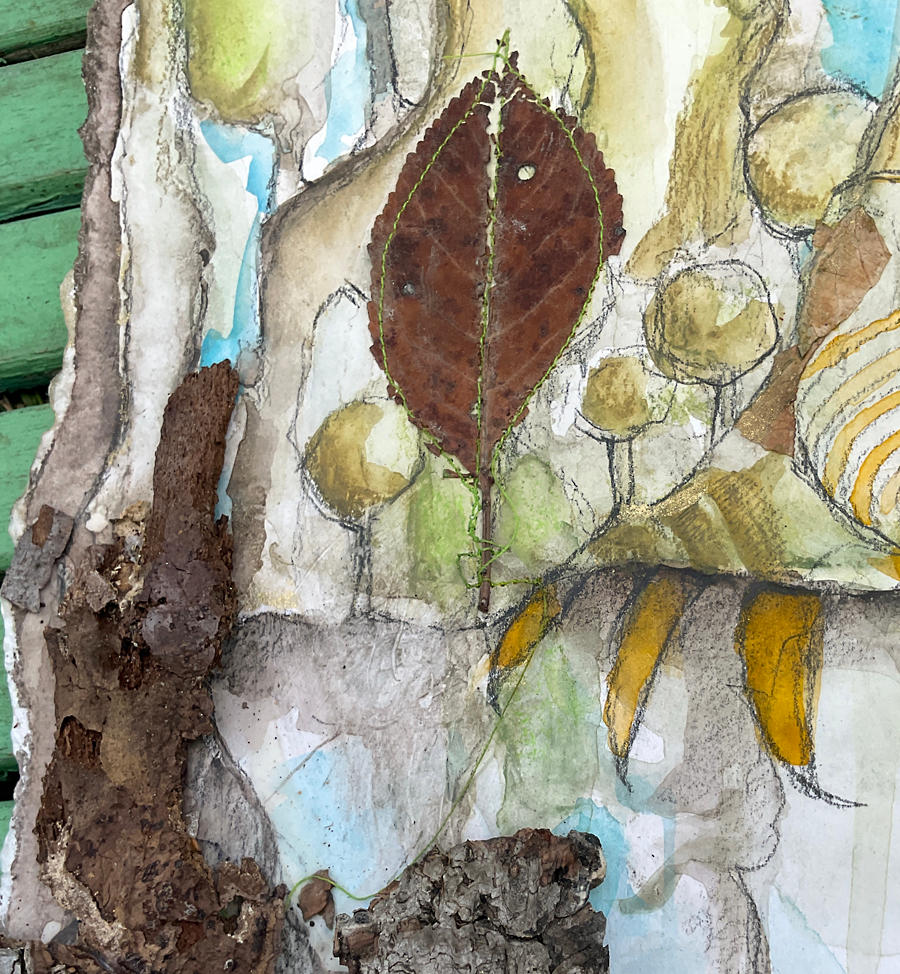 Seelenhaus Mixed Media auf Papier auf Holzplatte aufgezogen, gemalt, genäht, auf Holz montiert mit einem Aufhänger.  Du kannst es auch auf eine kleine Tischstaffelei stellen. zzgl. Versandkosten - Versandtage: Montag und Donnerstag