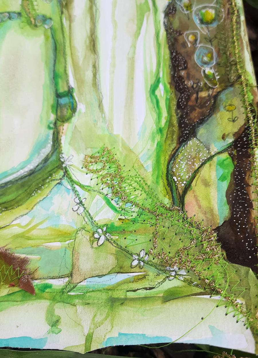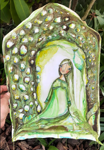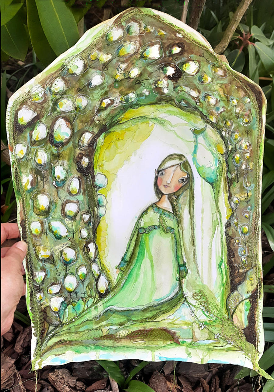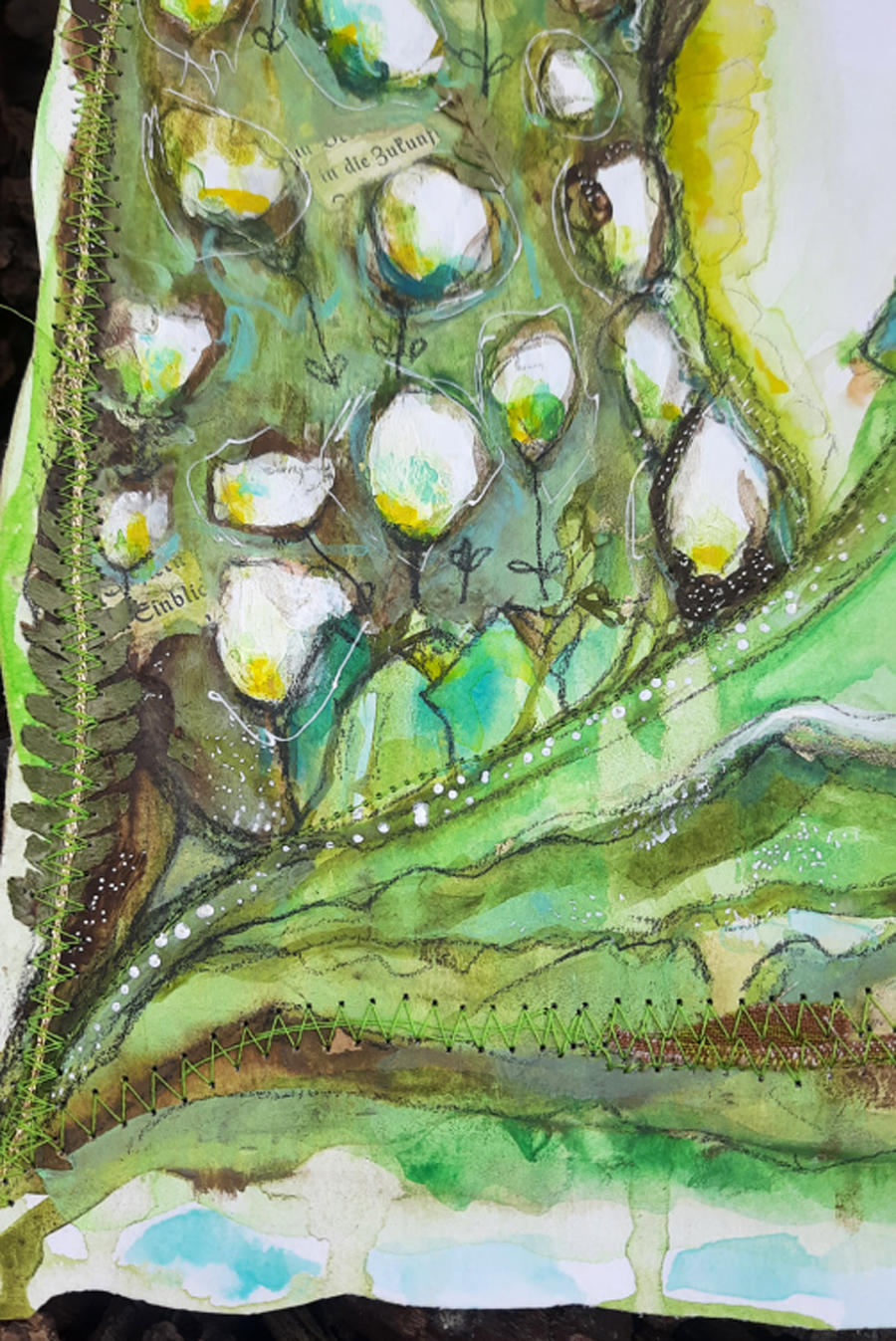 Seelenhaus Mixed Media auf Papier mit originalen Pflanzen, Stoffapplikationen und genähten Elementen Es ist aus Erdpigmenten, Aquarellfarben, Fäden und auf Naturpapier mit Farn entstanden.  Du kannst es auch auf eine kleine Tischstaffelei stellen. zzgl. Versandkosten - Versandtage: Montag und Donnerstag